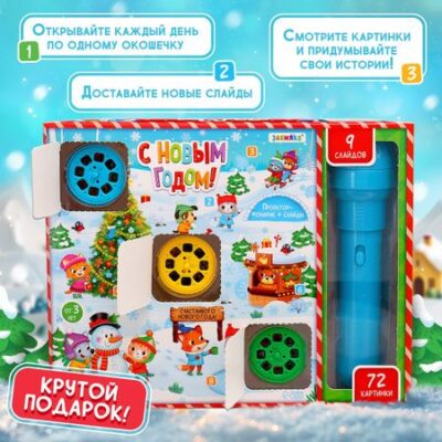 Адвент — календарь «Новогодний», детский, с проектором-фонариком, 9 окошек с подарками: 9 слайдов. Адвент-календарь на 9 дней «Новогодний» — то, что нужно для полезного и интересного досуга! Такой подарок поможет ребенку скрасить ожидание Нового года, станет прекрасным началом для развития творческих способностей ребенка. Открывайте каждый день по одному окошечку, доставайте новые слайды, смотрите картинки и придумывайте свои истории! С игрушкой ребенок научится создавать изображения, потренирует воображение, мелкую моторику и абстрактное мышление. <b> Особенности адвент-календаря</b> <ul> <li> В набор входит проектор-фонарик и 9 слайдов (72 цветных картинки).</li> <li> В коробочке 9 окошек. Новый день — это новое окошко, в котором находятся слайды с яркими картинками.</li> <li> Размер проектора: 15 × 4 см.</li> <li> Диаметр слайда: 2,5 см.</li> <li> Для работы необходимы 3 батарейки типоразмера AG10 (L1131). Батарейки в комплекте, но предназначены для демонстрационных целей. Для дальнейшей работы рекомендуется заменить старые батарейки на новые.</li> </ul> Товар предназначен для детей от 3 лет.