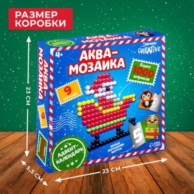 Адвент — календарь новогодний «Аквамозаика», детский, 9 окошек с подарками, 9 карточек, 1000 шариков. Адвент-календарь скрасит дни в ожидании праздника и поможет весело и с пользой провести время. Набор представляет собой коробку с 9 окошками. Новый день — это новое окошко, в котором находятся шарики для сборки аквамозаики. Аквамозаика — это набор с множеством мелких цветных бусинок, которые можно соединять вместе с помощью воды. Дети могут создавать различные рисунки и фигурки, укладывая бусинки на специальную подставку, а затем опрыскивая их водой. <b> Как играть</b> <ol> <li> Положите шаблон под подставку.</li> <li> Укладывайте бусинки на подставке, следуя шаблону.</li> <li> Равномерно опрыскайте фигурку водой из распылителя.</li> <li> Оставьте фигурку высыхать на несколько часов.</li> <li> Когда фигурка высохнет, снимите ее с подставки.</li> </ol> <b> Особенности аквамозаики</b> <ul> <li> Под воздействием воды бусинки надежно склеиваются друг с другом.</li> <li> Шарики выполнены из безопасного для детей материала.</li> <li> В комплект входят бусинки, площадка для сборки фигурок, пинцет, баночка-распылитель и трафареты для сборки.</li> </ul> Рекомендуется для детей старше 4 лет.