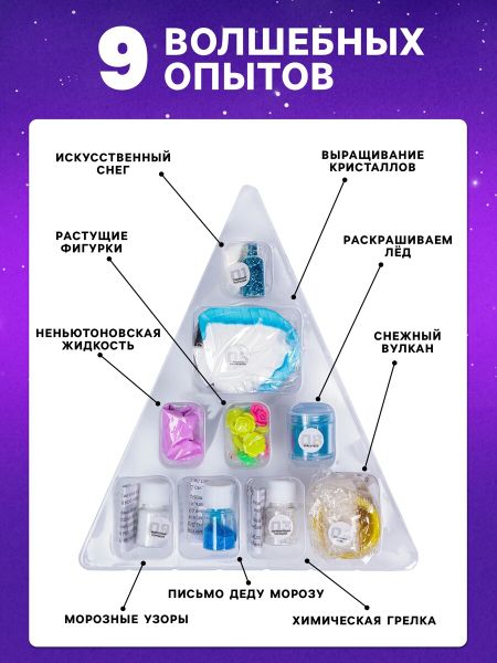 Адвент — календарь новогодний «Холодное сердце: Химические опыты», детский, 9 окошек с подарками: 9 опытов. Любой праздник это долгожданное чудо — для любого ребенка! Помните, как тянулись дни до начала долгожданного торжества? Лицензия и «Эврики» разработали красочный и увлекательный адвент-календарь, чтобы скрасить это ожидание. Набор состоит из коробки с 9 окошками. Новый день — это новое окошко, в котором находятся материалы для проведения таких опытов, как: — Искуственный снег — Неньютоновская жидкость — Кристалл — Дополнительные элементы для опыта