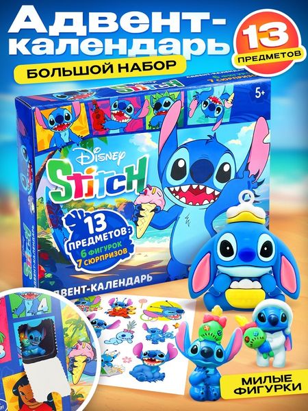 Адвент-календарь «Стич» — 13 сюрпризов для яркого праздника!Погрузитесь в мир веселья и приключений с очаровательным Стичем! Этот адвент-календарь подарит вам незабываемые моменты ожидания праздника. За каждой из 11 окошек скрываются уникальные сюрпризы, которые сделают каждый день ярче.Что внутри?6 милых фигурок Стича — добавьте в свою коллекцию культовых персонажей Disney.Браслет — стильный аксессуар для вашего образа.Значок и акриловая фигурка — для истинных фанатов!Татуировки и наклейки — для креативного самовыражения.Поделка — создайте своими руками фигурку Стича.Волчок и подвеска — для активных игр.ОсобенностиПодходит для детей от 5 лет.Удобный формат — можно дарить или радовать себя.Яркий дизайн упаковки с лабиринтом внутри.Создайте праздничное настроение для себя и своих близких с адвент-календарём «Стич». Каждый сюрприз — это шаг навстречу сказке!
