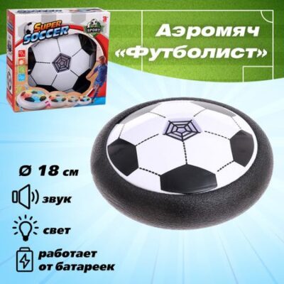 Аэромяч «Футболист», звуковые и световые эффекты, работает от батареек. Аэромяч «Футболист» — это увлекательная игрушка для активных игр. Легкий и компактный мячик плавно скользит по любой гладкой поверхности благодаря встроенному воздушному потоку, который работает от батареек. Игрушка идеально подходит для детей от 3 лет, обеспечивая безопасность игры благодаря мягким защитным краям. <b> Особенности</b> <ul> <li> Диаметр 18 см — оптимальный размер для игры дома или на улице.</li> <li> Световые и звуковые эффекты разнообразят игру и сделают еще интереснее!</li> <li> Питание от 4-х батареек типа АА — удобное решение для длительной работы без необходимости частой замены батареек.</li> <li> Мягкие края — защищают мебель и стены от повреждений при столкновении, делая игру безопасной даже в помещении.</li> <li> Подходит для детей старше 3-х лет — развивает координацию движений и внимание ребенка.</li> </ul> <b> Весело и безопасно</b> Аэромяч «Пенальти» подарит ребенку море удовольствия от игры, не нарушая спокойствия в доме. Благодаря продуманной конструкции, мяч легко скользит по полу, не повреждая поверхность и не создавая лишнего шума. Отличный выбор для активных игр в помещении!