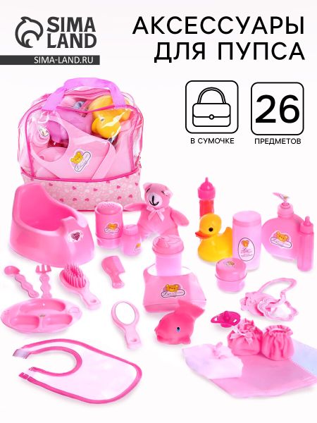 Аксессуары для пупса, набор 26 предметов, в сумке. Малышка придет в восторг от невероятного набора! Теперь игра в дочки-матери станет по-настоящему увлекательной, ведь в стильном наборе аксессуаров есть все необходимое для ухода за любимым пупсом! <b> Что в наборе:</b> <ul> <li> горшок (подходит для пупсов высотой до 32 см);</li> <li> соска;</li> <li> 2 бутылочки для кормления;</li> <li> 5 баночек средств для ухода за пупсом (имитация);</li> <li> поильник;</li> <li> 2 расчески (массажная и гребень);</li> <li> тарелочка;</li> <li> вилка и ложка;</li> <li> зеркальце;</li> <li> 3 игрушки для пупса;</li> <li> прорезыватель для пупса (для детей не подходит);</li> <li> пара трусиков для пупса;</li> <li> носочки и пинетки;</li> <li> 2 слюнявчика (тканевый и пластиковый с карманом).</li> </ul> С таким набором можно кормить малыша и ухаживать за ним! <b> Играть в куклы — полезно</b> В процессе игры ребенок сможет развивать коммуникативные способности, фантазию, раскроет свой потенциал и реализует различные модели поведения.