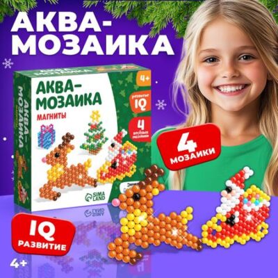 Аквамозаика «Олень с Дедом Морозом», магниты. С аквамозаикой от торговой марки «Эврики» ребенок соберет объемную фигурку из шариков. Детали плотно скрепляются друг с другом. Подделку можно повесить на холодильник как магнит. <b> Как сделать фигурку</b> <ol> <li> Разложить цветные бусинки по трафарету.</li> <li> Слега смочить фигурку водой.</li> <li> Дать мозаике высохнуть.</li> <li> Приклеить магнит на двустороннюю клейкую ленту.</li> <li> Снять детали с пленки и соединить их по схеме.</li> </ol> <b> В наборе:</b> <ul> <li> Бусинки.</li> <li> Баночка-распылитель для воды.</li> <li> Магнит.</li> <li> 4 трафарета.</li> </ul>