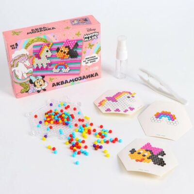 Аквамозаика с декорациями «Минни Маус и единорог», 3 фигурки, 300 шариков. С аквамозаикой с декорациями «Минни Маус» ребенок соберет из шариков-пикселей 3 объемных фигурки, потренирует мелкую моторику и внимание. С поделками можно играть или украсить интерьер. <b> Как сделать фигурку</b> <ol> <li> Выберите рисунок и поместите его под прозрачную основу.</li> <li> С помощью пинцета выложите цветные шарики по образцу.</li> <li> Наберите в бутылочку воды.</li> <li> Распылите воду на фигурку так, чтобы бусинки были равномерно покрыты водой.</li> <li> Оставьте мозаику на 30–40 минут до полного высыхания.</li> <li> После высыхания аккуратно снимите поделку с основы.</li> <li> Заполните получившимися фигурками белые поля на красочном фоне.</li> </ol> <b> Польза занятий с аквамозаикой</b> Игра с мозаикой развивает мелкую моторику, цветовое восприятие и усидчивость, позволяет ребенку проявить креативность в удивительном процессе изготовления фигурки. Рекмоендовано детям от 4 лет.