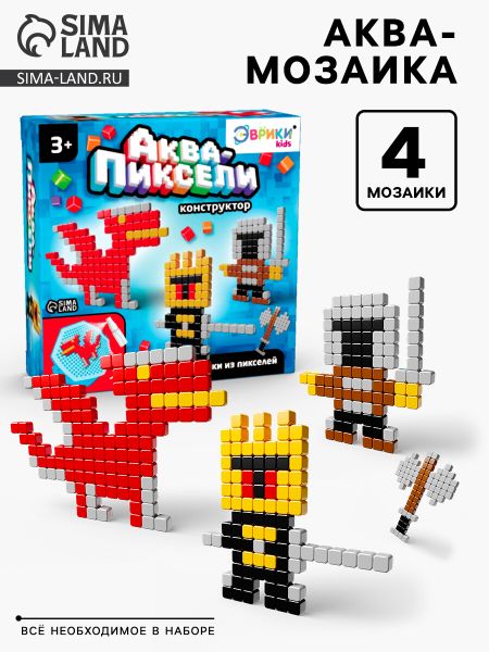 Аквапиксели «Воины», 400 деталей. С аквапикселями от торговой марки «Эврики» ребенок соберет объемную фигурку из кубиков-пикселей. Детали плотно скрепляются друг с другом. С поделкой можно играть или носить с собой как брелок. <b> Как сделать фигурку</b> <ol> <li> Положить пленку на основу.</li> <li> Разложить цветные кубики по трафарету.</li> <li> Слега смочить фигурку водой.</li> <li> Дать мозаике высохнуть.</li> <li> Убрать с основы детали вместе с пленкой.</li> <li> Снять детали с пленки и соединить их по схеме.</li> </ol> <b> В наборе:</b> <ul> <li> Пленка-основа.</li> <li> Кубики-пиксели.</li> <li> Баночка-распылитель для воды.</li> </ul>
