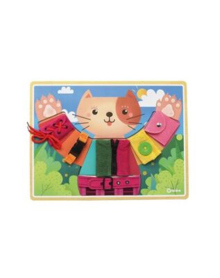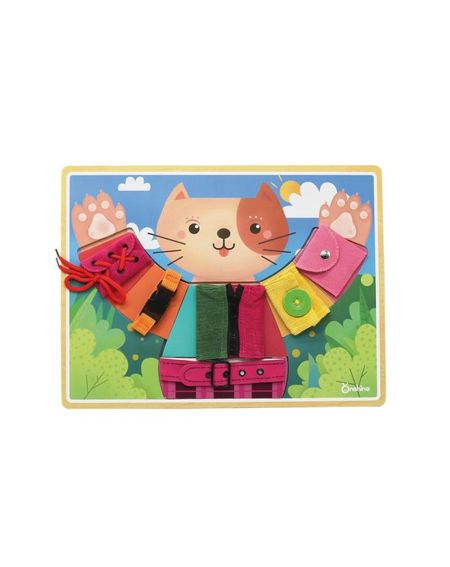 Basic Skills Board Little Cat Dress — Giant puzzle Cat, with 6 different activities. • Material — Wood fabriccloth. • Edad — +3 years. • Buckle (belt and seat belt), button, lace, snap, tie and zip puzzle game, training baby independent dressing skills. • 6 removable pieces and a puzzle board, basic life skill education toy. • Ideal for practice of fine motor skills, funny pretend play babysitter game, taking care of the little cat. • Perfect preschool developmental toys for infants, toddlers and preschoolers play. • Material: Wood with water-based safe paints.