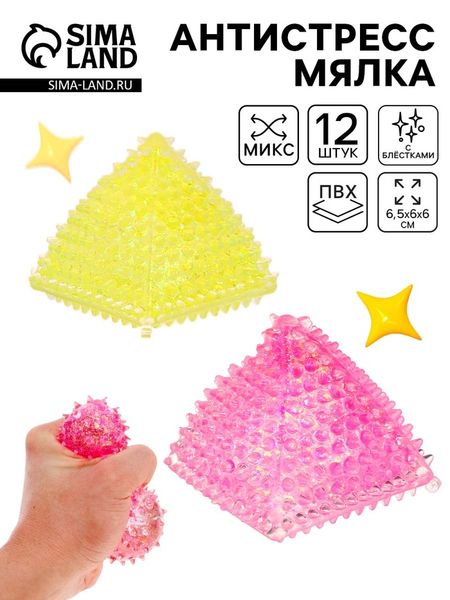Антистресс-игрушка «Пирамида с шипами» — это отличный способ расслабиться и поднять настроение. Игрушка наполнена блёстками, что делает её идеальной для снятия напряжения.ОсобенностиНаполнение — яркие блёстки.Компактный размер игрушки — 6,5 × 6 см.Игрушку можно мять и сжимать, она быстро возвращается в первоначальный вид.В шоубоксе 12 игрушек, что позволяет выбрать любимый цвет или поделиться с друзьями.Подходит для детей от 3 лет.Польза для развитияМялка «Пирамида с шипами» не только помогает справляться со стрессом, но и развивает мелкую моторику у детей. Мягкие мялки легко сжимаются в руке, помогая сосредоточиться и расслабиться. Её можно использовать дома, в дороге или на работе, чтобы быстро снять напряжение и поднять настроение.