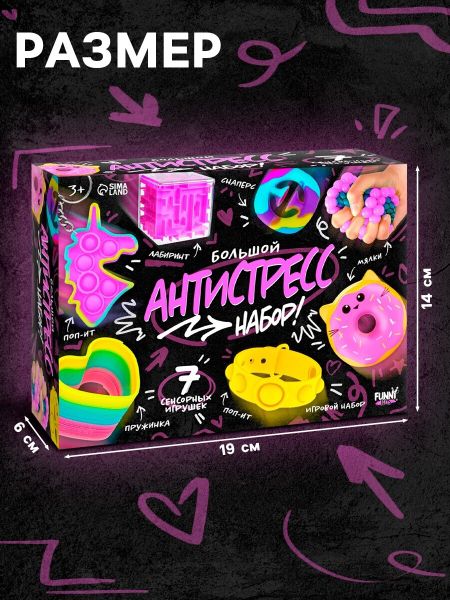 Антистресс игрушки, набор 7 шт.. Погрузитесь в мир спокойствия и увлекательных тактильных ощущений с антистресс набором для снятия напряжения. Семь разнообразных предметов созданы, чтобы помочь детям и взрослым отвлечься от суеты, развить мелкую моторику и просто получить удовольствие от игры. Каждый элемент набора продуман до мелочей: от приятных на ощупь мялок до пружинки-радуги, которая надолго увлечет любого. А головоломка лабиринт добавит нотку азарта и веселья. <b> Особенности</b> <ul> <li> 7 разных антистресс-игрушек позволяют выбрать именно то, что нужно в данный момент – будь то успокаивающее разминание или активная игра.</li> <li> Игрушки выполнены из прочного пластика и резины, подходят для детей от 3 лет.</li> <li> Способствуют сенсорному развитию, улучшают координацию движений и концентрацию внимания.</li> <li> Можно взять с собой в дорогу, на учебу или работу для быстрого снятия напряжения.</li> </ul> Антистресс набор – не просто коллекция игрушек, а продуманный комплект для релаксации, развития и радости. Позвольте себе и своим близким моменты легкости и беззаботности в любом месте и в любое время.