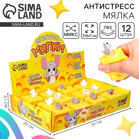 Антистресс-игрушка «Сырные прятки» — это отличный способ расслабиться и поднять настроение. Эластичная и упругая поверхность приятно мнется в руках, развивая мелкую моторику и тактильные ощущения.ОсобенностиИгрушка не содержит наполнителя, что делает её лёгкой и надёжной для детских игр.При сжатии мышка выпрыгивает из сыра, вызывая улыбку и удивление.Компактный размер игрушки — 7 × 5 см.Игрушку можно мять и сжимать, она быстро возвращается в первоначальный вид.В шоубоксе 12 игрушек, что позволяет выбрать любимый цвет или поделиться с друзьями.Польза для развитияМялка «Сырные прятки» не только помогает справляться со стрессом, но и развивает мелкую моторику у детей. Мягкие мялки легко сжимаются в руке, помогая сосредоточиться и расслабиться. Её можно использовать дома, в дороге или на работе, чтобы быстро снять напряжение и поднять настроение.