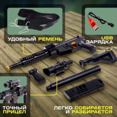Автомат «М416», стреляет мягкими пулями, работает от аккумулятора. Стильный и реалистичный автомат «М416» позволит маленькому герою почувствовать себя героем фильма про солдат или спецагентов. Игрушка подходит для ролевых игр, в которых дети смогут придумывать сотни увлекательных сценариев с неожиданными поворотами сюжета. <b> Особенности</b> <ul> <li> В комплекте 10 мягких пуль из материала EVA, чтобы игры были максимально безопасными.</li> <li> Прицел и глушитель придают оружию реалистичный вид.</li> <li> Игрушка работает от аккумулятора. Зарядное устройство входит в комплект.</li> </ul> <b> Развиваемся, играя</b> Нарисуйте на листе бумаги мишень, прикрепите его к стене или подвесьте прищепкой на веревочке. С помощью такой игры ребенок потренирует меткость, ловкость и точность.