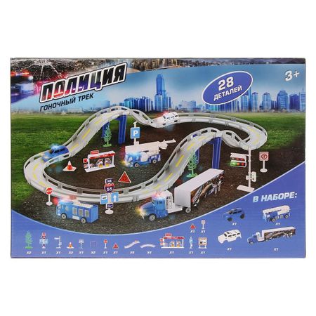 Автотрек «Полиция», 1 машина работает от батареек + сменный кузов, длина трассы 180 см. С детским автотреком «Полиция» ребенок устроит захватывающие гонки на длинной трассе, организует преследование преступника и спасет город от опасности. <b> Особенности автотрека «Полиция»</b> <ul> <li> Набор состоит из 28 деталей, кольцевая трасса собирается из 10 элементов.</li> <li> Все детали выполнены из качественного пластика.</li> <li> Размер автомобиля со сменным кузовом: 7,7 × 3,2 × 3,5 см. Машинка самоходная. Для работы потребуется 1 батарейка АА (в комплект не входит).</li> <li> Размер пожарной машины: 7,5 × 2,8 × 4 см.</li> <li> Размер грузовика: 20 × 3 × 4 см.</li> <li> Для автомобильной трассы подойдут машинки масштабом 1:64.</li> <li> В набор входят элементы окружения: дорожные знаки, деревья и заправочная станция.</li> <li> Для детей старше 3 лет.</li> </ul>