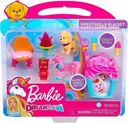 Introducing the perfect playset for your little ones imaginative adventures — the Dreamtopia Sweetsville Playset! With this magical playset, your child can embark on a sweet journey through the whimsical world of Dreamtopia. The set comes with a colorful candy-themed castle, complete with turrets and a working elevator. Your child can help Barbie and her friends explore the castle, ride the candy carousel, and even take a dip in the chocolate pool! The set also includes adorable figures of Barbie and her friends, each dressed in their own unique candy-inspired outfit. Made with high-quality materials, this playset is built to last and provide endless hours of imaginative play. Give your child the gift of magic and wonder with the Dreamtopia Sweetsville Playset!