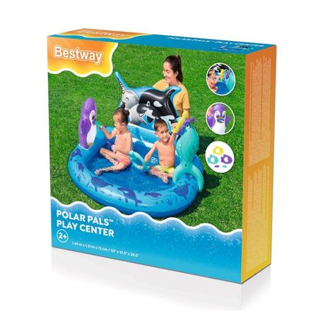В комплект входят: 1 бассейн, 3 кольца-рыбки, 2 рыбки из пеноматериала, 1 надувной тюлень, ремонтная заплата
