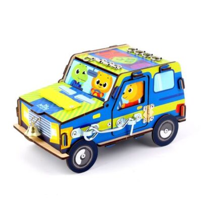 Бизиборд «Машинка». Бизиборд — игрушка, которая опробована педагогами, разработчиками методик обучения, а также непосредственно родителями малышей. В процессе игры с бизибордом ребенок будет познавать мир, ознакомится с предметами быта, а также получит навыки самообслуживания (завязывание шнурков, застегивание молнии и мн.др). Несомненные плюсы бизиборда: <ul> <li> изучение различных свойств предметов</li> <li> формирование навыков открывания и закрывания различных замков</li> <li> развитие мелкой моторики и самостоятельности 7 активностей: <ul> <li> липучка</li> <li> колокольчик</li> <li> крючок</li> <li> щеколда</li> <li> колесо</li> <li> рамка-вкладыш</li> <li> шнуровка</li> </ul> </li> </ul>