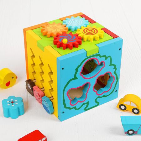 Бизиборд «Цветной». Деревянные игрушки — это первые друзья вашего крохи, с их помощью он развивается и познает мир. Они прочные, долговечные и экологически чистые. Особая фактура древесины благотворно влияет на развитие мелкой моторики пальчиков. Куб — это полноценный логический центр, каждая стенка которого представляет собой отдельный развивающий тренажер. <b> Оранжевая сторона:</b> помогите малышу найти подходящие парковочные места для машинок. Расскажите ему о разных видах транспорта и их предназначении. <b> Желтая сторона:</b> изучаем счет! Забавные картинки-перевертыши познакомят кроху с азами математики. <b> Голубая сторона:</b> предложите ребенку подобрать подходящее место на дереве каждому обитателю. Обсудите маленькие чудеса природы: как цветут растения, как птички вьют гнезда на ветках. <b> Красная сторона:</b> задача малыша — передвигать забавные мордочки по зигзагообразной линии. Такое увлекательное занятие развивает мелкую моторику и тренирует руку для письма. <b> Зеленая сторона:</b> при движении одной шестеренки остальные фигурки тоже начинают крутиться. Помогите крохе проследить, как детали двигают друг друга, это поможет развитию его логического мышления. Игрушка позволяет ребенку изучить азы счета, натренировать руку для письма, познакомиться с понятиями геометрических фигур и замечательно провести время.