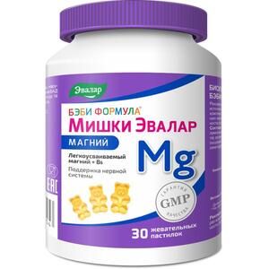 Бэби Формула Мармеладные мишки с легкоусвояемым магнием для поддержки нервной системы ребятишек.Для устранения дефицита магния, для поддержки нервной системы ребенка, для снижения раздражительности и поддержания здорового сна.Ваш ребенок стал раздражительным? Тогда его нервной системе точно требуется срочная витаминная поддержка! В такой ситуации просто необходим магний в легкоусвояемой органической форме – именно он содержится в новых витаминах для самых маленьких – Бэби формула мишки магний от Эвалар.Магний в связке с витамином В6 способствует: Устранению дефицита магния Поддержке нервной системы ребенка при повышенных нагрузках Снижению раздражительности Поддержке здорового сна Снятию мышечных спазмов и судорогПремущества: Первые мармеладные мишки с легкоусваиваемым магнием для снятия раздражительности! Приятный вкус Подходят детям с 3-х лет Без искусственных красителей, ароматизаторов и консервантов Без глютена и ГМОКак работают ингредиентыМагний. Один из самых важных биоэлементов, с участием которого в организме происходит большинство физиологических процессов. Кроме того, магний – это нейропротектор, он играет важную роль в регуляции проницаемости гематоэнцефалического барьера. Также, магний принято считать центральным элементом, поддерживающим баланс процессов возбуждения-торможения в центральной нервной системе, поэтому он полезен для детей, особенно с симптомами СДВГ2.Витамин В6. Участвует в синтезе нейромедиаторов, регулируя настроение, сон и аппетит. Отвечает за выработку миелина, обеспечивая защиту нервных волокон, и их регенерацию при повреждениях.
