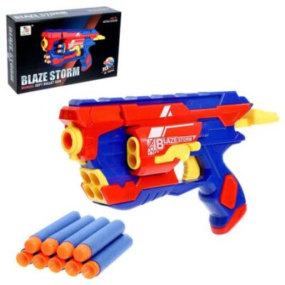 Бластер «Один», стреляет мягкими пулями. В набор входит: <ul> <li> Пульки с присоской — 5шт;</li> <li> Пульки с круглым наконечником (5 шт) — 1 х 1 х 7 см.</li> </ul>