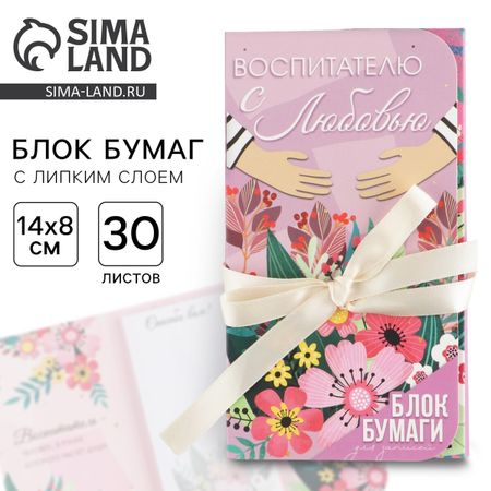 Блок бумаг с липким слоем «Воспитателю с любовью» 40 листов. Блок бумаг для записей станет прекрасным подарком на праздник. <ul> <li> Обложка : мягкая ;</li> <li> Форма: прямоугольная ;</li> <li> Количество листов: 40 ;</li> <li> Блок: дизайнерский ;</li> <li> Склейка: липкий слой ;</li> <li> Упаковка: пакет.</li> </ul> Состав: бумага, картон.