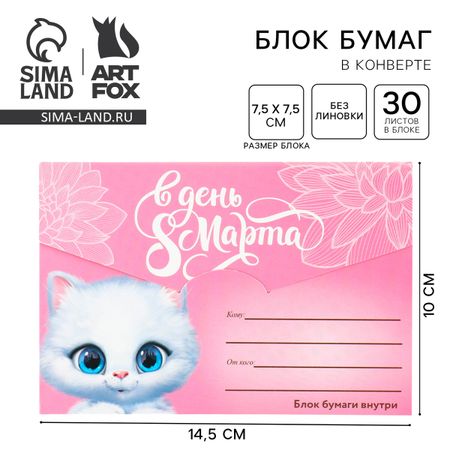 Блок бумаги 30 листов в конверте «С 8 Марта». Блок бумаг для записей станет прекрасным подарком на праздник. <ul> <li> Обложка: мягкая ;</li> <li> Форма: прямоугольная ;</li> <li> Количество листов: 30 ;</li> <li> Блок: дизайнерский ;</li> <li> Тип скрепления: на отрывной склейке.</li> </ul>