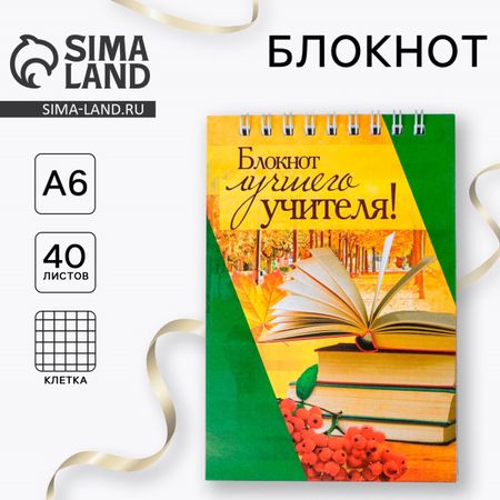 Блокнот «Лучшему учителю», на гребне, формат А6, 40 листов. Блокнот отлично подойдет в качестве подарка. Яркий дизайн несомненно привлечет внимание и будет выделяться , а удобный формат позволит использовать с комфортом. • Пиши • Планируй • Выполняй <ul> <li> Обложка : мягкая;</li> <li> Количество листов: 40;</li> <li> Крепление : на гребне/спирали;</li> <li> Линовка : клетка;</li> <li> Формат: А6.</li> </ul> Состав: Бумага, картон.