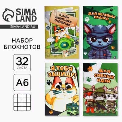 Блокнот А6, 32 листа, набор из 4 шт. в пакете «Котик защитник. 23 февраля». Набор блокнотов станет прекрасным подарком на праздник. • Мечтай; • Записывай; • Выполняй. <ul> <li> Формат: А6;</li> <li> Линовка блока: клетка;</li> <li> Форма: прямоугольник;</li> <li> Количество листов: 32;</li> <li> Тип скрепления: на скобе.</li> </ul>