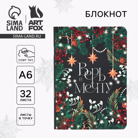Блокнот, А6, 32 листа, софт тач «Верь в мечту». Блокнот в мягкой обложке станет прекрасным подарком на праздник. • Мечтай; • Записывай; • Выполняй. <ul> <li> Формат:А6;</li> <li> Форма: прямоугольник ;</li> <li> Количество листов: 32 ;</li> <li> Линовка блока: точка ;</li> <li> Тип скрепления: на скобе;</li> <li> Упаковка: пакет.</li> </ul> Состав: бумага.