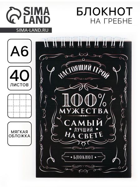 Блокнот А6, 40 листов на гребне, в клетку «100% мужества». Блокнот станет прекрасным подарком на праздник. • Мечтай; • Записывай; • Выполняй. <ul> <li> Формат: А6;</li> <li> Форма: прямоугольник;</li> <li> Количество листов: 40;</li> <li> Тип скрепления: на гребне/спирали;</li> <li> Упаковка: пленка.</li> </ul> Состав: бумага, картон.