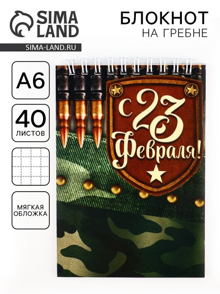 Блокнот А6, 40 листов на гребне, в клетку «С 23 Февраля». Блокнот станет прекрасным подарком на праздник. • Мечтай; • Записывай; • Выполняй. <ul> <li> Формат: А6;</li> <li> Форма: прямоугольник;</li> <li> Количество листов: 40;</li> <li> Тип скрепления: на гребне/спирали;</li> <li> Упаковка: пленка.</li> </ul> Состав: бумага, картон.