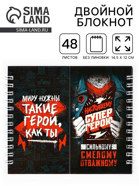 Блокнот двойной, на гребне, мягкая обложка, размер 15×12см, 48 листов «Настоящему СУПЕР ГЕРОЮ». Двойной блокнот станет прекрасным подарком на праздник. • Мечтай; • Записывай; • Выполняй. <ul> <li> Размер см.: 14.5 х 12;</li> <li> Форма: квадрат;</li> <li> Количество листов: 48;</li> <li> Тип скрепления: на гребне/спирали;</li> <li> Упаковка: пленка.</li> </ul> Состав: бумага, картон.
