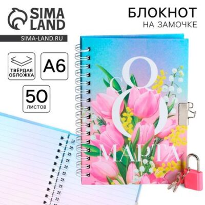 Блокнот на замочке А6, 50 л. «С 8 МАРТА». Блокнот на замочке станет прекрасным подарком на праздник. • Мечтай; • Записывай; • Выполняй. <ul> <li> Формат: А6;</li> <li> Форма: прямоугольник;</li> <li> Количество листов: 50;</li> <li> Тип скрепления: на гребне/спирали;</li> <li> Упаковка: пакет.</li> </ul> Состав: бумага, картон.