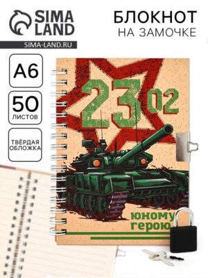 Блокнот на замочке А6, 50 листов в твердой обложке «23 февраля. Юному герою». Блокнот на замочке станет прекрасным подарком на праздник. • Мечтай; • Записывай; • Выполняй. <ul> <li> Формат: А6;</li> <li> Форма: прямоугольник;</li> <li> Количество листов: 50;</li> <li> Тип скрепления: на гребне/спирали;</li> <li> Упаковка: пакет.</li> </ul> Состав: бумага, картон.