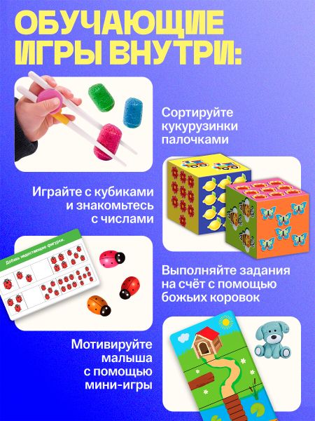 Большой набор «Учимся считать», 65 предметов, 3+. Набор для изучения счета — отличный выбор для первых шагов ребенка в мир чисел, цветов и фигур. Этот комплект рассчитан на детей от 3 лет, что делает его подходящим для раннего развития и увлекательного обучения через игру. <b> Особенности набора</b> <ul> <li> Карточки с заданиями для изучения счета и базовых математических понятий.</li> <li> Игровые кубики, которые помогают развивать моторику и знакомят с числами.</li> <li> Элементы, обучающие распознаванию фигур и цветов.</li> <li> Все, что нужно для увлекательного обучения в игровой форме.</li> </ul> <b> Играем с пользой</b> Занятия с набором формируют полезные навыки, включая умение считать, распознавать формы и цвета, а также развивают мелкую моторику. Этот комплект станет отличным помощником в подготовке ребенка к школе.