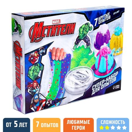 Большой набор опытов «Мстители», 7 крутых опытов. С большим набором опытов «Мстители» ребенок сможет провести 7 крутых опытов, в результате которых у него получатся необычные игрушки. Отправляйтесь вперед к научным открытиям вместе с любимыми героями Marvel! <b> Какие опыты вас ждут:</b> <ol> <li> Кристаллы с Халком.</li> <li> Камни бесконечности.</li> <li> Рисунки светом.</li> <li> Морозный рисунок.</li> <li> Удивительные вулканы.</li> <li> Волшебная жижа.</li> <li> Невидимые чернила.</li> </ol> <b> Особенности набора</b> <ul> <li> В комплекте подробная инструкция.</li> <li> Все компоненты набора безопасны и безвредны для детей.</li> <li> В коробке уже есть абсолютно все, что понадобится для эксперимента.</li> </ul> <b> Увлекательно и полезно</b> Занимательные эксперименты помогут развить мышление и логику, привить стремление проникать в суть вещей и пробудят желание открывать новое. Набор предназначен для детей старше 5 лет.