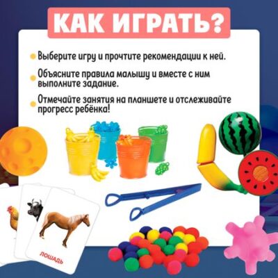 Большой развивающий набор, от 1 года. Помогите ребенку раскрыть потенциал с большим развивающим набором! Ведь благодаря четкому системному подходу и продуманной программе вы ничего не упустите ничего в развитии малыша! В большой набор входит 7 игр, основанных на различных методиках всестороннего развития. К каждой игре прилагаются подробные рекомендации по использованию с описанием, полезными заданиями и упражнениями. Игры в наборе направлены на развитие важных навыков ребенка с учетом его потребностей. <b> Что в наборе</b> <ul> <li> Сенсорные игрушки. Благодаря ярким игрушкам ребенок разовьет мелкую моторику, внимание и цветовосприятие.</li> <li> Сортер «Ведерки» и сортер «Стирка». Сортируя разноцветные предметы, ребенок закрепляет знания о цветах и фигурах, расширяет кругозор и развивает мелкую моторику.</li> <li> Пинцет Монтессори. С этим инструментом для занятий по уникальной методике ребенок овладеет навыком захвата.</li> <li> Набор бомбошек для игры в сортеры.</li> <li> Карточки по методике Домана с фигурками животных. Развивайте память, внимательность и кругозор ребенка интересным заданиями.</li> <li> Лото для малышей. С этой игрой ребенок прокачает логическое мышление и распознавание предметов.</li> <li> Пластиковые фрукты. Плоды на липучках ребенок сможет самостоятельно резать и познакомится с такими понятиями, как деление, половина и доля.</li> <li> Планер. Отслеживайте прогресс малыша и планируйте новые занятия!</li> </ul> Большой развивающий набор рекомендован для детей от 1 года.