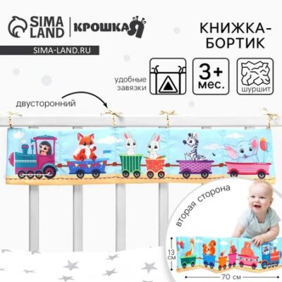 Бортик на кроватку «Паровозик» 14×70 см, Крошка Я. <em> Развиваем малыша с первых месяцев!</em> Мягкая книжка-бортик «Паровозик» — это двусторонняя развивающая игрушка для малышей. Яркие картинки и шуршащие элементы помогают ребенку познавать мир через тактильные и зрительные ощущения. <b> Особенности</b> <ul> <li> Крупные изображения стимулируют зрительное восприятие, расширяют кругозор. Малыш учится фокусировать взгляд, запоминает формы и цвета.</li> <li> Шуршащие вставки тренируют слух и моторику — ребенок тянется к звуку, пробует захватывать страницы. Мягкие материалы безопасны для малышей от 3 месяцев.</li> <li> Длина 70 см идеально подходит для кроватки. Фиксируется завязками, не сползает.</li> </ul> <b> Развитие с первых месяцев</b> Книжка-бортик заменяет несколько развивающих игрушек — сочетает тактильные, звуковые и зрительные стимулы. Подходит мальчикам и девочкам, крепится на любую кроватку. С ней первые «уроки» малыша проходят весело и с пользой!