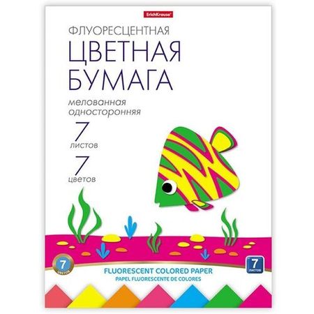 Цветная бумага мелованная односторонняя формата А4 (203х280 мм). Яркие флуоресцентные цвета. В наборе 7 листов, 7 цветов. Плотность наполнения — 80 г/м2. Тип скрепления — клей. На оборотной стороне обложки приводятся инструкции по изготовлению поделок.