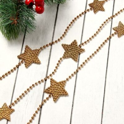 Бусы на елку «Объемные звезды», длина 2.7 м, бронзовые. Эти объемные новогодние звезды из бронзового пластика длиной 2,7 метра станут эффектным украшением елки и праздничного интерьера. Их яркий металлический оттенок и объемная форма создают ощущение глубины и роскоши, идеально дополняя праздничный декор к Новому году. Особенности <ul> <li> Длина – 2,7 метра, что позволяет оформить крупную елку или создать эффектные гирлянды и композиции.</li> <li> Форма – бусины в виде объемных звезд, выполненные из пластика.</li> <li> Цвет – бронзовый, придающий украшениям теплый металлический блеск.</li> <li> Материал – прочный и легкий пластик обеспечивает долговечность и безопасность.</li> <li> Тематика – подходит для оформления новогодней елки и зимних праздников.</li> <li> Особенность – однотонная поверхность подчеркивает стильность и универсальность украшения.</li> </ul> Преимущества использования <ul> <li> Создают эффект объемных звезд, придающих елке особую выразительность.</li> <li> Обеспечивают возможность оформления различных декоративных композиций благодаря длине и форме.</li> <li> Легко сочетаются с другими праздничными украшениями, такими как гирлянды, мишура и игрушки.</li> </ul> Эти бронзовые объемные звезды станут надежным элементом зимнего декора. Их классический дизайн подчеркнет атмосферу праздника и добавит уюта в ваш дом. Просты в использовании и долговечны, они сохранят свой привлекательный вид на многие сезоны зимних праздников, радуя вас каждый год.