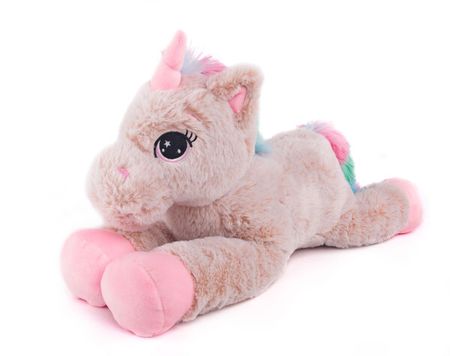 Лежачий единорог пастельного бежевого оттенка с разноцветной гривой и хвостиком, и мягким нежным мехом будет оценен по достоинству каждым ребенком. Его очень приятно держать в руках или гладить по мягкой шерстке. Игрушка изготовлена из качественных безопасных материалов.