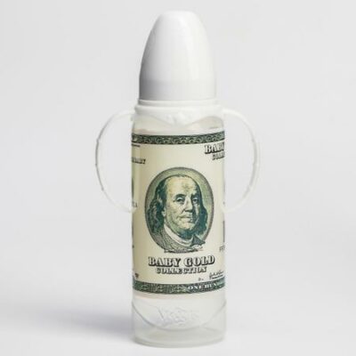 Бутылочка для кормления M&B «100 долларов», классическое горло, с ручками, от 0 мес., 250 мл., цилиндр. Пластиковая бутылочка мало весит, поэтому ее удобно давать ребенку. Износостойкий материал прослужит около 2 лет. Особенности: Силиконовая соска не имеет вкуса и запаха. Ребра жесткости соски не дают ей сминаться во время кормления. Кольцо бутылочки имеет рельефные элементы, имитирующие ареолы груди. Выпуклая мерная шкала помогает точно определить объем питания. Ёмкость выполнена в классической прямой форме. Изделие не содержит бисфенол А. Бутылочка с оригинальным дизайном порадует не только кроху, но и родителей!