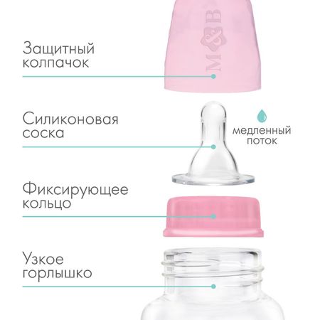 Бутылочка для кормления M&B, классическое горло, от 0 мес., 150 мл., приталенная, розовый. Пластиковая бутылочка мало весит, поэтому ее удобно давать ребенку. Износостойкий материал прослужит около 2 лет. <b> Особенности</b> <ul> <li> Силиконовая соска не имеет вкуса и запаха.</li> <li> Средний поток оптимален для молока, молочных смесей, воды и чая.</li> <li> Ребра жесткости соски не дают ей сминаться во время кормления.</li> <li> Кольцо бутылочки имеет рельефные элементы, имитирующие ареолы груди.</li> <li> Выпуклая мерная шкала помогает точно определить объем питания.</li> <li> Эргономичная форма емкости разработана специально для удобного захвата.</li> <li> Изделие не содержит бисфенол А.</li> </ul> Детская бутылочка изготовлена в России из сырья отечественного производства. Все материалы сертифицированы и безопасны для здоровья новорожденных. Полипропилен и силикон не выделяют вредных веществ при стерилизации и контакте с жидкостью.