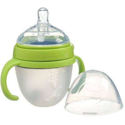 Бутылочка для кормления M&B, широкое горло Ø70 мм, от 3 мес, 150 мл., с ручками, силиконовая колба, зеленый. Бутылочка M&B изготовлена из нежного, гиппоаллергенного, пищевого силикона. Анатомическая форма естественным образом имитирующая грудное вскармливание, а наличие антиколиковой системы препятствует возникновению колик у малыша. <b> Особенности:</b> • Анатомическая форма корпуса максимально напоминает материнскую грудь, а ее приятная матовая поверхность не позволяет малышу выронить бутылочку из маленьких ручек. • Гибкий съемный гравитационный шарик позволит ребенку пить в любом положении. • Соска бутылочки содержит в себе два отверстия для воздуха, что позволяет младенцу не прикладывать усилий для питания. • Благодаря широкому горлышку бутылочку удобно мыть руками, без использования специальных щеток. • Корпус бутылочки содержит удобную шкалу, благодаря которой, вы не ошибетесь, при кормлении малыша детскими смесями. • С помощью нескользящих ручек подросший малыш сможет пить самостоятельно и управлять потоком жидкости. • Состав бутылочки не содержит красящих элементов — она абсолютно безвредна и рассчитана на долговременное использование. • Детскую бутылку можно стерилизовать, кипятить до 5 мин (бутылочка термостойкая), а так же мыть в посудомоечной машине.