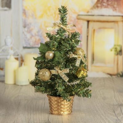 Искусственная елка настольная «Зимнее волшебство. Бантик» 25 см, ветки ПВХ отгибаются, игрушки золото шары и банты. Зимнее волшебство