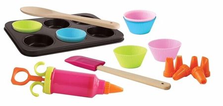 «Маленькая хозяйка всегда готова помочь маме сделать вкусные десерты. Теперь она на кухне будет со своим игрушечным инвентарем: ярким, прочным и безопасным:•Количество элементов: 27•Форма для выпечки. Размер: 19 х 12,5 см•Форма для выпечки. Размер: 14х 7,5 см•Форма для выпечки фигурная•Металлическая миска. D 11,7 см•Силиконовые формочки для кексов: 6 шт.•Кондитерский шприц•Насадки для кондитерского шприца: 6 шт.•Лопаточка кондитерская с силиконовым наконечником•Деревянная лопаточка•Скалка•Силиконовая кисточка•Венчик•Набор мерных ложек»