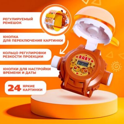 Часы-проектор «Жирафик», свет. Часы-проектор показывают время и красочные картинки. Малыш научится правильно определять часы и минуты, а также поиграет со встроенным в устройство проектором. <b> Вы можете установить на часах дату и время.</b> <ul> <li> Дважды нажмите на кнопку «В2» и выберите нужный месяц с помощью кнопки «В1».</li> <li> Нажмите на кнопку «В2» и установите день с помощью кнопки «В1».</li> <li> Нажмите на кнопку «В2» и установите текущее время с помощью кнопки «В1».</li> <li> Нажмите на кнопку «В2» и установите минуты с помощью кнопки «В1».</li> <li> Нажмите на кнопку «В2» один раз, чтобы вернуться к режиму часов.</li> </ul> <b> Особенности часов</b> <ul> <li> На экране отображаются часы и минуты. Чтобы посмотреть время, нужно поднять крышку в виде жирафика.</li> <li> В часы встроен проектор с регулировкой резкости.</li> <li> Проектор показывает 24 ярких картинки с жирафами.</li> <li> Чтобы включить свет и переключить картинку, нужно нажать на левую кнопку.</li> <li> Для регулировки резкости изображения нажимайте на правую кнопку.</li> <li> Размер часов: 7,5 × 5,5 × 5 см.</li> <li> Размер ремешка: 3 × 0,2 × 22 см, регулируется по длине.</li> <li> Для работы необходимы 4 батарейки типоразмера LR41 (входят в комплект).</li> </ul> Часы-проектор рекомендованы детям старше 3 лет.