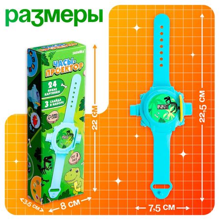 Часы-проектор «Динозавры», световые эффекты, 24 картинки, цвет голубой. Часы-проектор «Динозавры» показывают время и красочные картинки. Малыш научится правильно определять часы и минуты, а также поиграет со встроенным в устройство проектором. <b> Как настроить часики</b> Нажмите на левую кнопку, чтобы приступить к выбору времени, затем нажмите правую кнопку для подтверждения выбора. <b> Особенности часов</b> <ul> <li> Время и дата поочередно сменяют друг друга на дисплее часов.</li> <li> В комплекте 3 слайда с 24 яркими картинками с разными динозаврами.</li> <li> Ремешок регулируется по размеру запястья малыша.</li> <li> Для работы часов необходимы 3 батарейки типоразмера L1131 (AG10). Батарейки в комплекте, но предназначены для демонстрационных целей. Для дальнейшей работы рекомендуется заменить старые батарейки на новые.</li> </ul> <b> Как пользоваться проектором</b> <ul> <li> Наденьте часики на руку ребенка.</li> <li> Выберите слайд и вставьте его в специальное отверстие на часах.</li> <li> Возьмите лист бумаги или выберите свободное место на стене.</li> <li> Нажмите кнопку и удерживайте ее. Выбранная картинка будет проецироваться на бумагу или стену.</li> <li> Крутите слайд и переключайте изображения.</li> </ul> <b> Польза занятий с часами-проектором «Динозавры»</b> Игрушка научит создавать изображения, поможет развить усидчивость, воображение и абстрактное мышление. Рекомендовано детям от 3 лет.