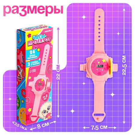 Часы-проектор «Милашки», световые эффекты, 24 картинки, цвет розовый. Часы-проектор «Милашки» показывают время и красочные картинки. Малышка научится правильно определять часы и минуты, а также поиграет со встроенным в устройство проектором. <b> Как настроить часики</b> Нажмите на левую кнопку, чтобы приступить к выбору времени, затем нажмите правую кнопку для подтверждения выбора. <b> Особенности часов</b> <ul> <li> Время и дата поочередно сменяют друг друга на дисплее часов.</li> <li> В комплекте 3 слайда с 24 яркими картинками с милыми животными.</li> <li> Ремешок регулируется по размеру запястья малыша.</li> <li> Для работы часов необходимы 3 батарейки типоразмера L1131 (AG10). Батарейки в комплекте, но предназначены для демонстрационных целей. Для дальнейшей работы рекомендуется заменить старые батарейки на новые.</li> </ul> <b> Как пользоваться проектором</b> <ul> <li> Наденьте часики на руку ребенка.</li> <li> Выберите слайд и вставьте его в специальное отверстие на часах.</li> <li> Возьмите лист бумаги или выберите свободное место на стене.</li> <li> Нажмите кнопку и удерживайте ее. Выбранная картинка будет проецироваться на бумагу или стену.</li> <li> Крутите слайд и переключайте изображения.</li> </ul> <b> Польза занятий с часами-проектором «Милашки»</b> Игрушка научит создавать изображения, поможет развить усидчивость, воображение и абстрактное мышление. Рекомендовано детям от 3 лет.