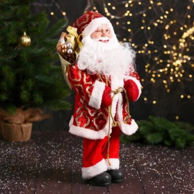Дед Мороз под елку «Зимнее волшебство. Новогодняя игрушка в шубе», 47 см, красный. Фигурка «Дед Мороз в узорчатой шубе с подвязкой, 47 см» станет ярким акцентом вашего новогоднего декора и подарит особую атмосферу праздника. Выразительный дизайн персонажа сочетается с универсальностью применения: от классического новогоднего барокко до современного скандинавского минимализма. Эта композиция органично дополнит пространство под елкой, на каминной полке или в фотозоне. <b> Особенности</b> <ul> <li> <strong> Идеальные пропорции:</strong> высота фигурки — 47 см, что делает ее заметным элементом интерьера.</li> <li> <strong> Качественные материалы:</strong> изготовлена из долговечных материалов, обеспечивающих сохранность внешнего вида.</li> <li> <strong> Элегантный дизайн:</strong> узорчатая шуба и аккуратная подвязка добавляют изысканности образу.</li> <li> <strong> Простота использования:</strong> не требует источников питания или сложного ухода.</li> <li> <strong> Символ праздника:</strong> Дед Мороз становится центральным элементом новогоднего декора.</li> <li> <strong> Традиционная атмосфера:</strong> без световых и звуковых эффектов для создания уютной обстановки.</li> </ul>