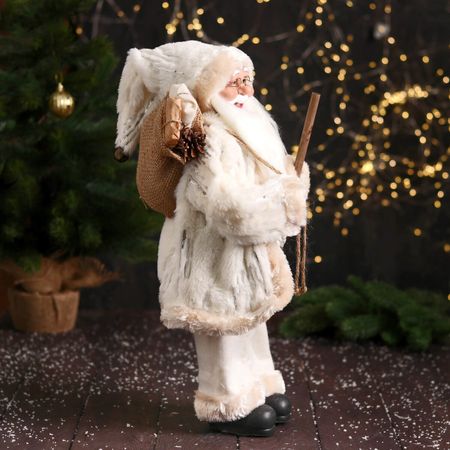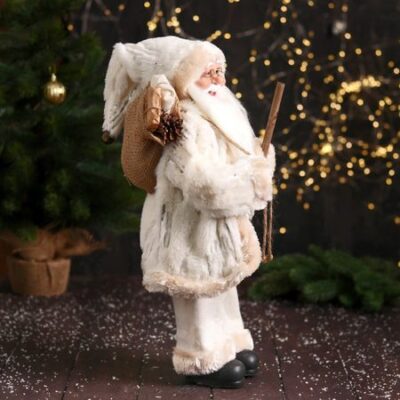 Дед Мороз под елку «Зимнее волшебство. Новогодняя игрушка с посохом и мешком», 47 см, белый. Дед Мороз в пушистой шубке и высотой 47 см станет замечательным элементом декора в Вашем интерьере. Украшение идеально сочетается с различными стилями интерьера. Его компактные размеры делают его универсальным решением для любой елки или праздничной композиции. Поставьте его под елку — и он станет центральной фигурой вашего праздничного оформления. Создайте свою историю зимней сказки — пусть этот Дед Мороз подарит вам атмосферу волшебства!