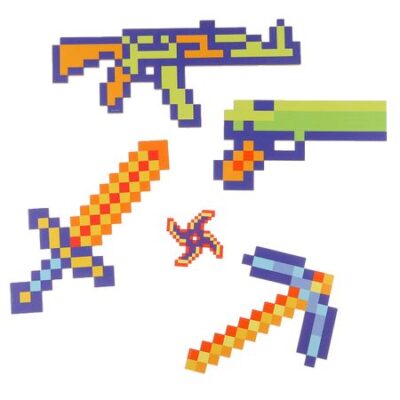 Деревянное оружие детское сувенирное «Пиксели», 5 предметов. Набор деревянного оружия «Пиксели» — это идеальный подарок для мальчиков и девочек на 23 Февраля или для активных игр в любое время. В комплекте пять предметов: меч, пистолет, кирка и ружье, которые помогут ребенку окунуться в мир приключений и почувствовать себя настоящим героем. Игрушки выполнены из экологичного дерева, безопасны и подходят для детей от 3 лет. <b> Особенности набора</b> <ul> <li> Изготовлен из прочного дерева, тщательно отшлифован для безопасности.</li> <li> Лезвие меча не острое, что исключает риск травм.</li> <li> В наборе пять предметов для разнообразных игровых сценариев.</li> <li> Подходит для игр в «войнушку» и других ролевых развлечений.</li> </ul> С таким оружием дети смогут разыгрывать захватывающие сценарии, развивая фантазию и социальные навыки. Игрушки легкие, удобно лежат в руке, а их стильный дизайн в стиле «пиксели» добавляет игре особый шарм. Набор станет отличным дополнением к коллекции игрушек для активных игр. <b> Важно!</b> Рекомендуем не оставлять детей без присмотра во время игры. Набор упакован в пленку, что делает его удобным для хранения и транспортировки.