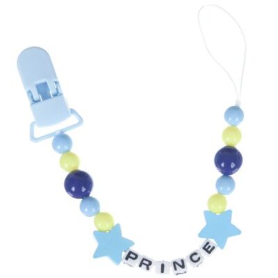 Держатель для соски — пустышки «Prince». Прищепка для пустышки предотвратит потерю маленького предмета. Используйте специальный держатель, и соска всегда будет под рукой! Изделие фиксируется на одежде ребенка. На конце цепочки есть карабин, который зацепляется за кольцо пустышки. Надежное крепление убережет вещь от падения на пол, если малютка случайно выронит ее изо рта. С держателем можно играть, притягательный дизайн точно понравится малышу. Товар изготовлен из качественного нетоксичного материала. Подходит для деток с рождения.